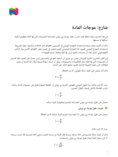 في هذا الدرس، سوف نتعلَّم كيف نحسب طول موجة دي برولي المصاحبة للجسيمات التي لها كتلة، بمعلومية كمية حركتها أو سرعتها.