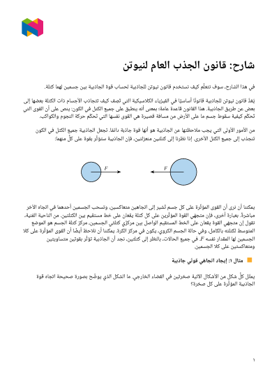 في هذا الدرس، سوف نتعلَّم كيف نستخدم قانون نيوتن للجاذبية لحساب قوة الجاذبية بين جسمين لهما كتلة.