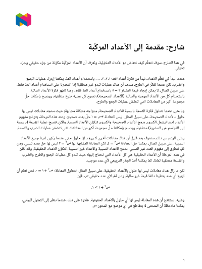 في هذا الدرس، سوف نتعلَّم كيف نتعامل مع الأعداد التخيُّلية، ونَعرِف أن الأعداد المركَّبة مكوَّنة من جزء حقيقي وجزء تخيُّلي.