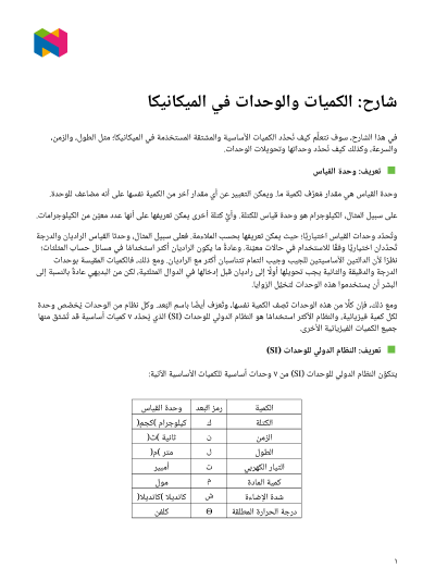 في هذا الدرس، سوف نتعلَّم كيف نحدِّد الكميات الأساسية والمشتقة المستخدمة في الميكانيكا، مثل الطول، والزمن، والسرعة، وكذلك تحديد وحداتها وتحويلات الوحدات.