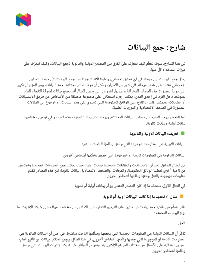في هذا الدرس، سوف نتعلَّم كيف نتعرَّف على الفرق بين كلٍّ من المصادر الأولية والثانوية لجمع البيانات، وكيف نتعرَّف على ميزات استخدام كلٍّ منهما.