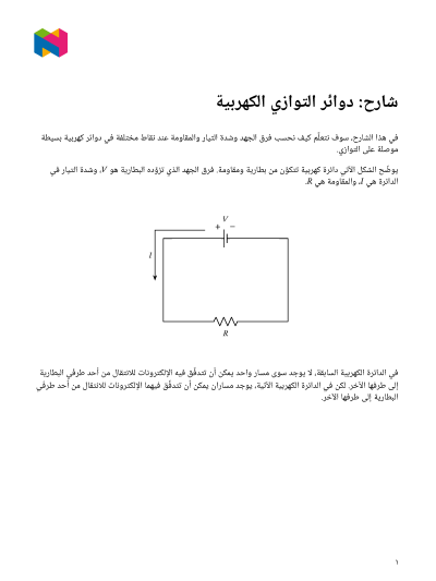في هذا الدرس، سوف نتعلَّم كيف نحسب فرق الجهد، وشدة التيار، والمقاومة عند نقاط مختلفة في دوائر كهربية بسيطة موصَّلة على التوازي.
