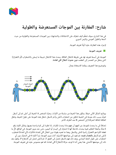 في هذا الدرس، سوف نتعلَّم كيف نتعرَّف على الاختلافات والتشابهات بين الموجات المُستعرضة والطولية من حيث السعة والطول الموجي والزمن الدَّوْري.