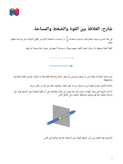 في هذا الدرس، سوف نتعلَّم كيف نستخدم المعادلة: p = F/A لحساب الضغط الناتج عن القُوى المؤثِّرة على مساحة مقطع معيَّن.