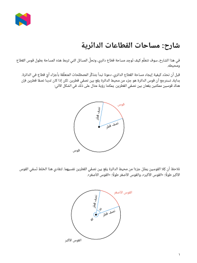في هذا الدرس، سوف نتعلَّم كيف نُوجِد مساحة قطاع دائري، ونحلُّ المسائل التي تربط هذه المساحة بطول قوس القطاع ومحيطه.