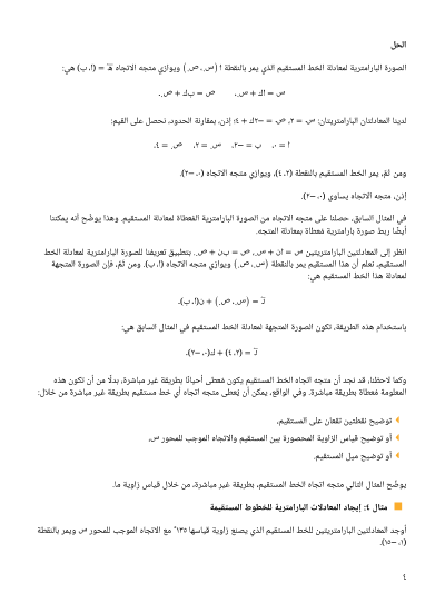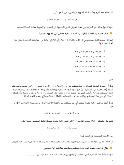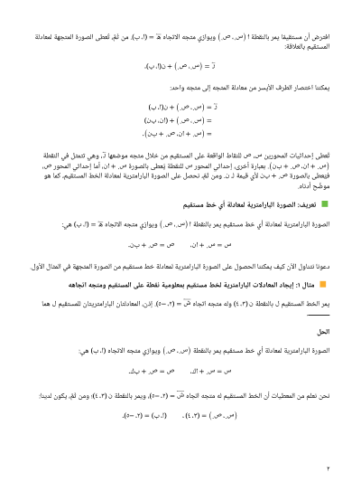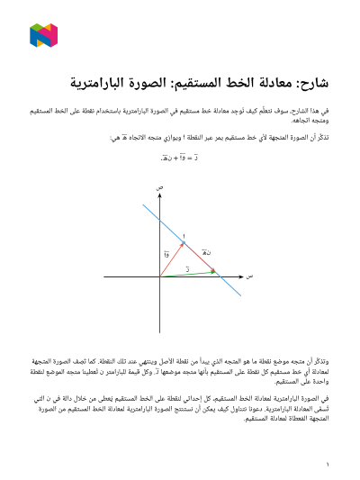 في هذا الدرس، سوف نتعلَّم كيف نُوجِد معادلة خط مستقيم في الصورة البارامترية باستخدام نقطة على الخط المستقيم ومتجه اتجاهه.