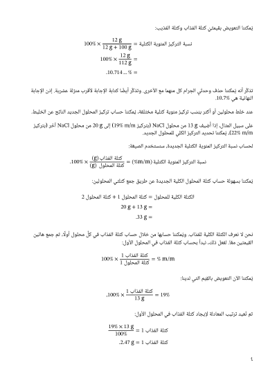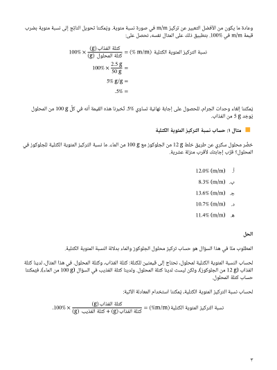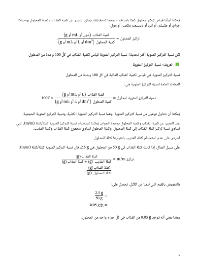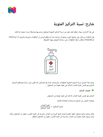 في هذا الدرس، سوف نتعلَّم كيف نعبِّر عن نسبة التركيز المئوية لمحلول، ونحسبها وفقًا لنسبة حجمه أو كتلته.