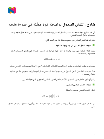في هذا الدرس، سوف نتعلَّم كيف نحسب الشغل المبذول بواسطة متجه قوة ثابتة تؤثِّر على جسم خلال متجه إزاحة باستخدام الضرب القياسي.