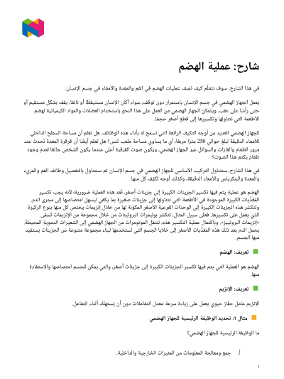 في هذا الدرس، سوف نتعلَّم كيف نَصِف عمليات الهضم في الفم والمعدة والأمعاء في جسم الإنسان.