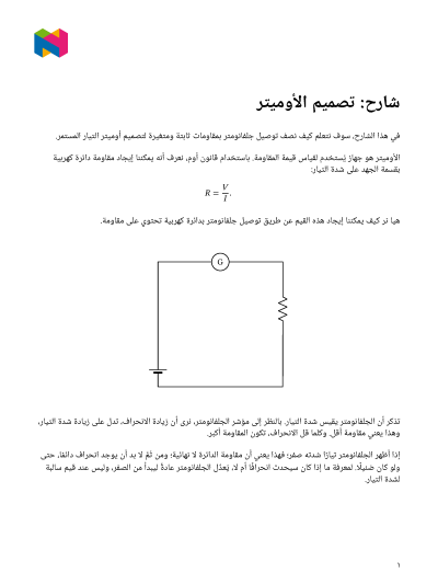 في هذا الدرس، سوف نتعلَّم كيف نَصِف توصيل جلفانومتر بمقاومات ثابتة ومتغيِّرة لتصميم أوميتر التيار المستمر.
