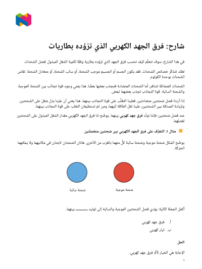 في هذا الدرس، سوف نتعلَّم كيف نحسب فرق الجهد الذي تزوِّده بطارية وفقًا لكمية الشغل المبذول لفصل الشحنات.