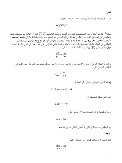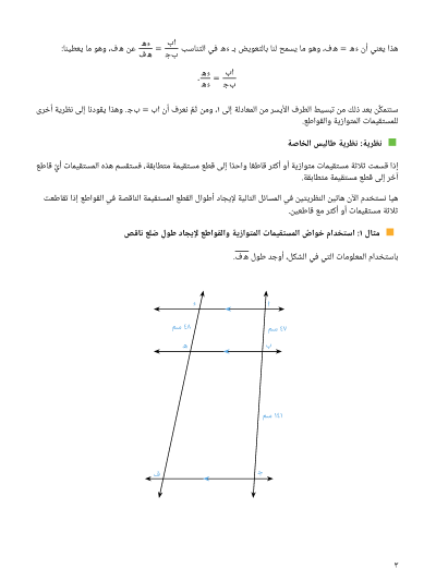 في هذا الدرس، سوف نتعلَّم كيف نستخدم توازي المستقيمات لإيجاد طولٍ ناقصٍ لقطعة مستقيمة في مستقيمٍ قاطِع؛ مقطوع بواسطة مستقيمات متوازية.