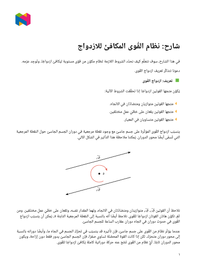 في هذا الدرس، سوف نتعلَّم كيف نحدِّد الشروط اللازمة لنظام مكوَّن من قوًى مستوية ليكافئ ازدواجًا، وإيجاد عزمه.