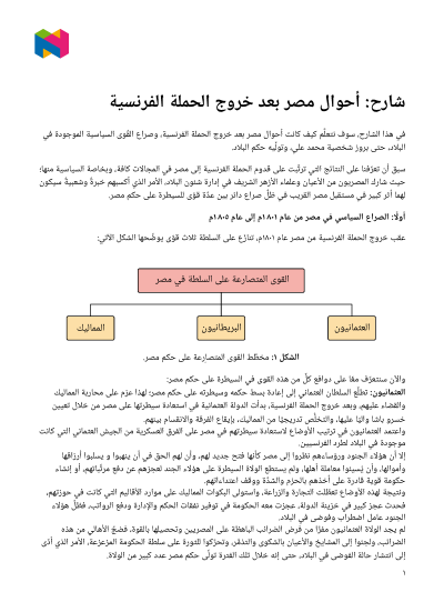في هذا الدرس، سوف نتعلَّم كيف كانت أحوال مصر بعد خروج الحملة الفرنسية، وصراع القُوى السياسية الموجودة في البلاد، حتى بروز شخصية محمد علي، وتولِّيه حكم البلاد.