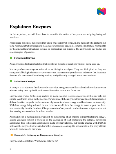In this lesson, we will learn how to describe the action of enzymes in catalyzing biological reactions.