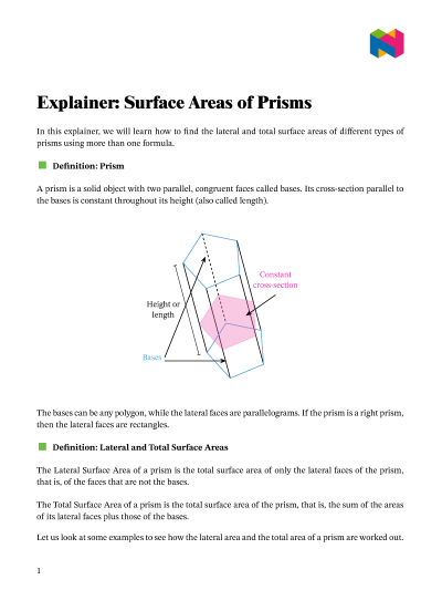 In this lesson, we will learn how to find the lateral and total surface areas of different types of prisms using more than one formula.