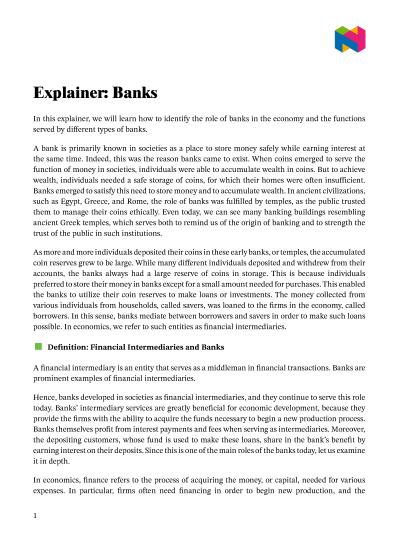 In this lesson, we will learn how to identify the role of banks in the economy and what functions are served by different types of banks.