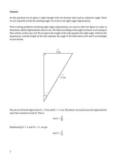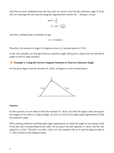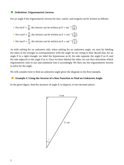 In this lesson, we will learn how to find a missing angle in a right triangle using the appropriate inverse trigonometric function given two side lengths.
