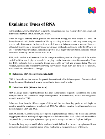 In this lesson, we will learn how to describe the components that make up RNA molecules and differentiate between tRNA, mRNA, and rRNA.