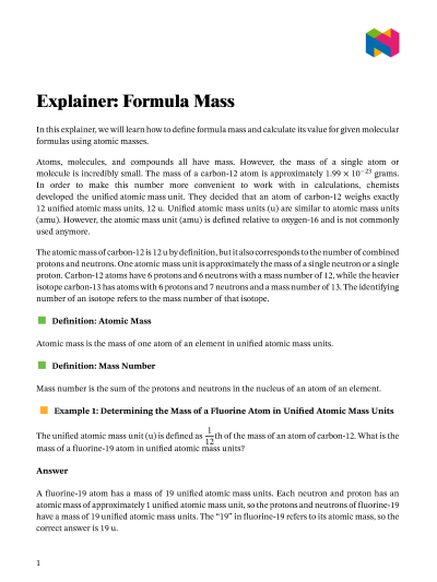 In this lesson, we will learn how to define formula mass and calculate its value for given molecular formulas using atomic masses.