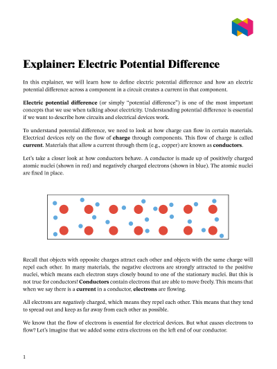 In this lesson, we will learn what electric potential difference is and how an electric potential difference across a component in a circuit creates a current in that component.