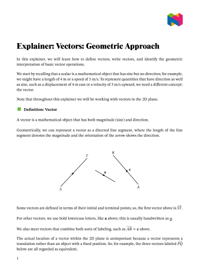 In this lesson, we will learn how to define and write vectors and the geometric interpretation of basic vector operations.