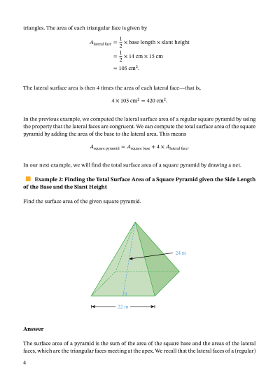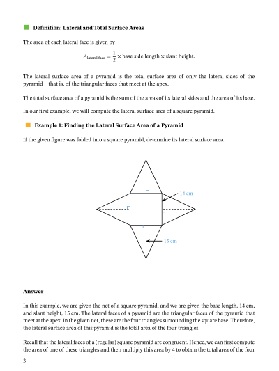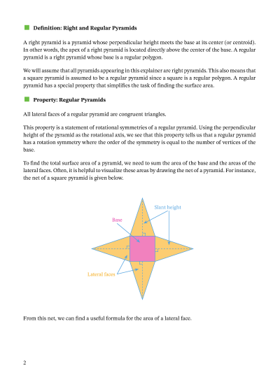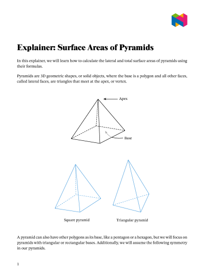 In this lesson, we will learn how to calculate the lateral and total surface areas of pyramids using their formulas.