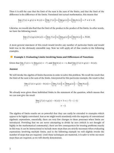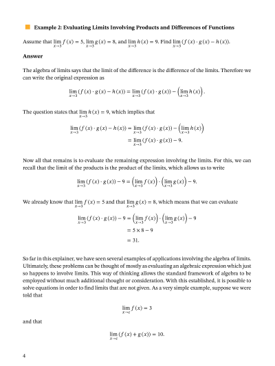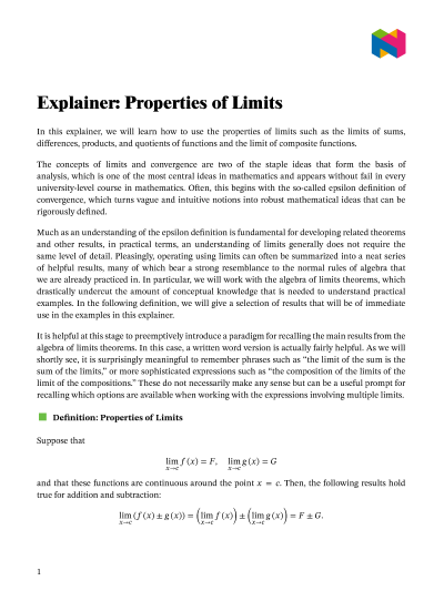 In this lesson, we will learn how to use the properties of limits such as the limits of sums, differences, products, and quotients of functions and the limit of composite functions.