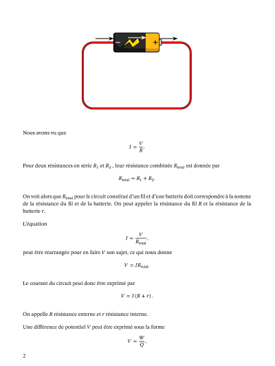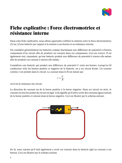 Dans cette leçon, nous allons apprendre à définir la relation entre la force électromotrice (f.é.m.) d’une pile par rapport à la tension à ses bornes et sa résistance interne.