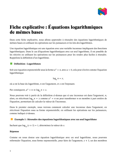 Dans cette leçon, nous allons apprendre comment résoudre des équations logarithmiques de mêmes bases en utilisant les opérations sur les puissances et les lois des logarithmes.