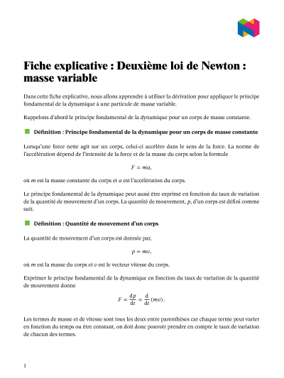 Dans cette leçon, nous allons apprendre comment utiliser la dérivation pour la deuxième loi de Newton sur le mouvement d'une particule de masse variable.