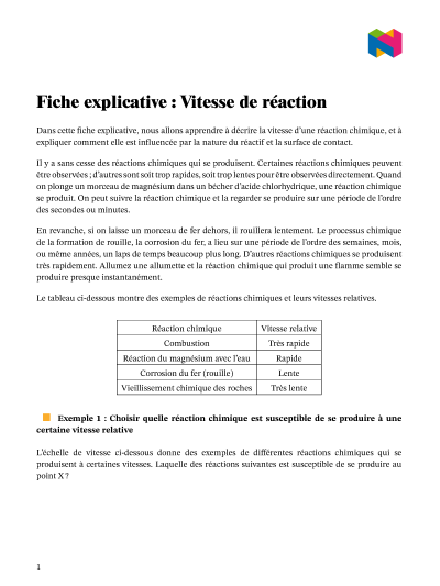 Dans cette leçon, nous allons apprendre à décrire la vitesse d’une réaction chimique, et à et expliquer comment elle est influencée par la nature du réactif et la surface de contact.