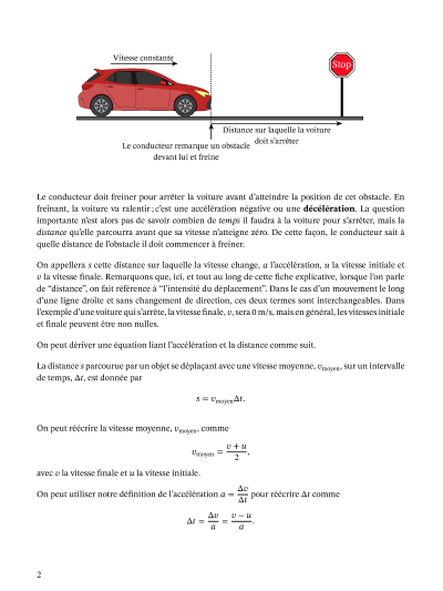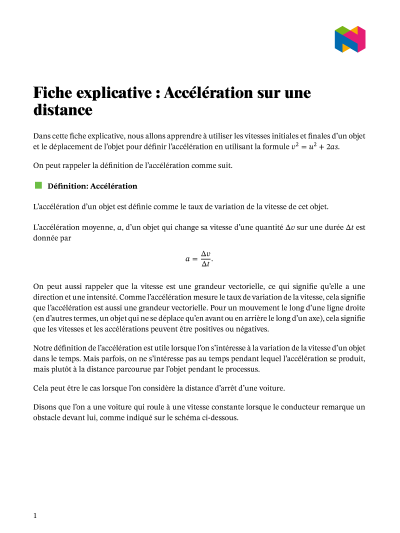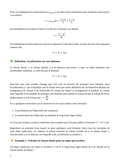 Dans cette leçon, nous allons apprendre comment utiliser les vitesses initiales et finales d’un objet ainsi que le déplacement de cet objet pour définir son accélération en utilisant la formule v² = u² + 2as.
