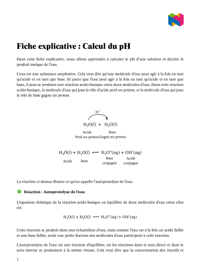Dans cette leçon, nous allons apprendre comment calculer le pH d’une solution, et comment décrire la constante de dissociation de l’eau.