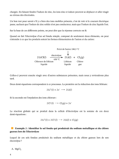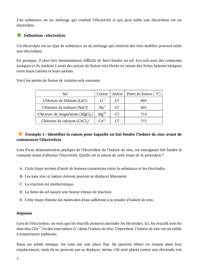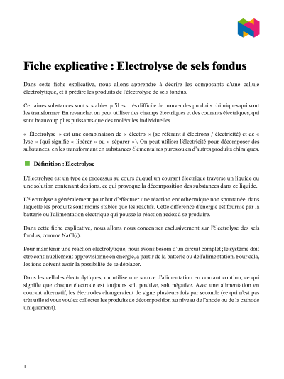 Dans cette leçon, nous allons apprendre à décrire les composants d’une cellule électrolytique, et à prédire les produits de l’électrolyse de sels fondus.