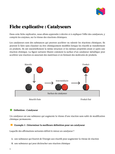 Dans cette leçon, nous allons apprendre comment décrire et expliquer l’effet des catalyseurs, y compris les enzymes, sur la vitesse des réactions chimiques.