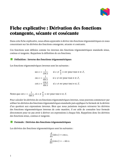 Dans cette leçon, nous allons apprendre à déterminer les dérivées des fonctions trigonométriques, en nous concentrant sur les dérivées des fonctions cotangente, sécante et cosécante.