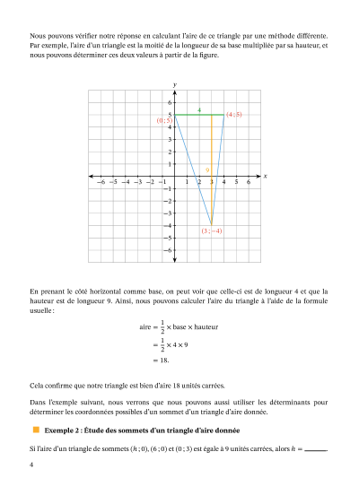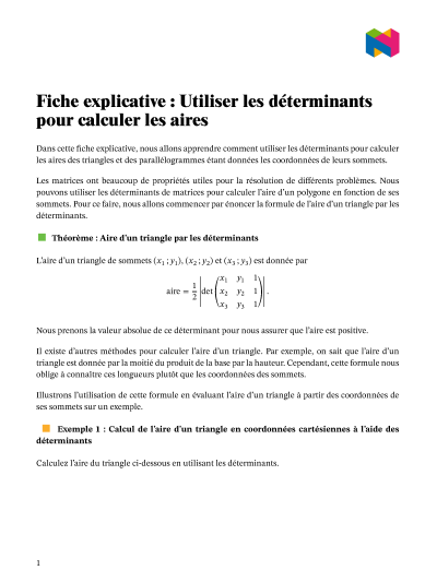 Dans cette leçon, nous allons apprendre comment utiliser les déterminants pour calculer les aires des triangles et des parallélogrammes étant données les coordonnées de leurs sommets.