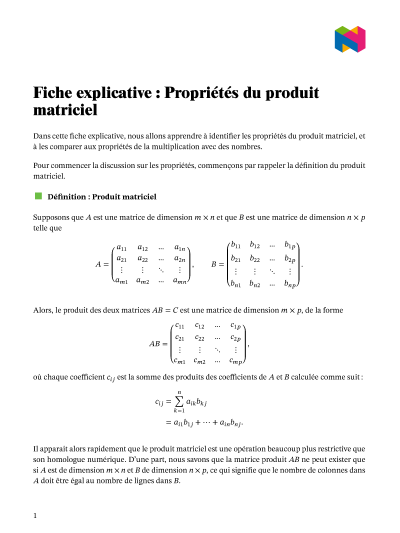 Dans cette leçon, nous allons apprendre à identifier les propriétés du produit matriciel, et à les comparer aux propriétés de la multiplication avec des nombres.
