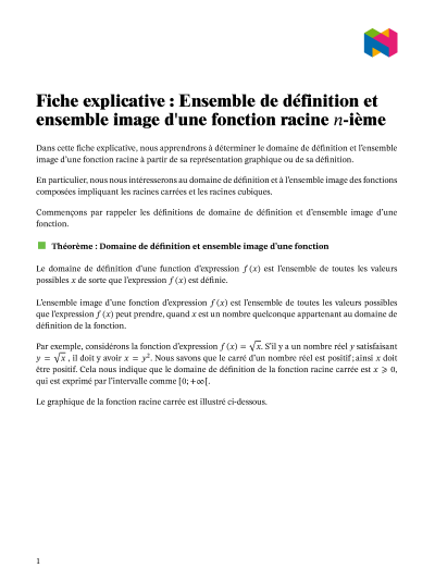 Dans cette leçon, nous allons apprendre comment déterminer l'ensemble de définition et l'ensemble image d'une fonction racine 𝑛-ième à partir de sa représentation graphique ou de sa règle de définition.