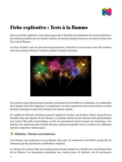 Dans cette leçon, nous allons apprendre comment identifier les utilisations du test à la flamme et les couleurs produites par les métaux alcalins, les métaux alcalino-terreux et les autres métaux lors d’un test à la flamme.