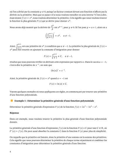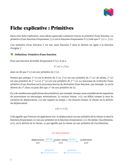 Dans cette leçon, nous allons apprendre comment déterminer la primitive d'une fonction. La primitive d'une fonction 𝑓(𝑥) est la fonction 𝐹(𝑥) où 𝐹′(𝑥) = 𝑓(𝑥).
