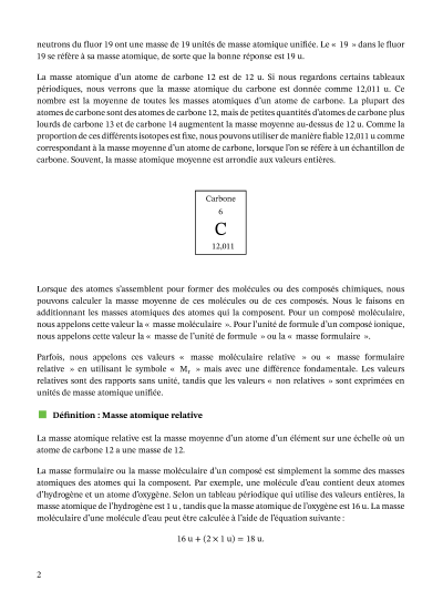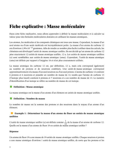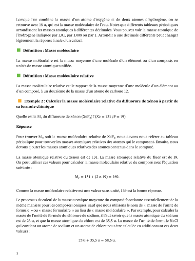 Dans cette leçon, nous allons apprendre à définir la masse moléculaire, et à calculer sa valeur pour des formules moléculaires données en utilisant les masses atomiques.