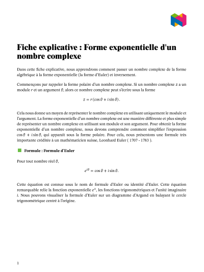 Dans cette leçon, nous allons apprendre comment convertir la forme algébrique d'un nombre complexe en forme exponentielle (forme d'Euler) et vice-versa.