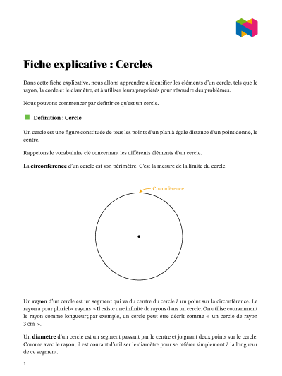 Dans cette leçon, nous allons apprendre à identifier les éléments d'un cercle, tels que le rayon, la corde et le diamètre, et à utiliser leurs propriétés pour résoudre des problèmes.