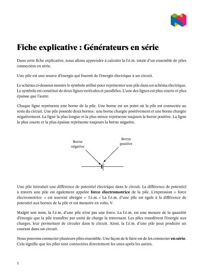 Dans cette leçon, nous allons apprendre comment calculer la force électromotrice (f.é.m.) d’un ensemble de générateurs montés en série.