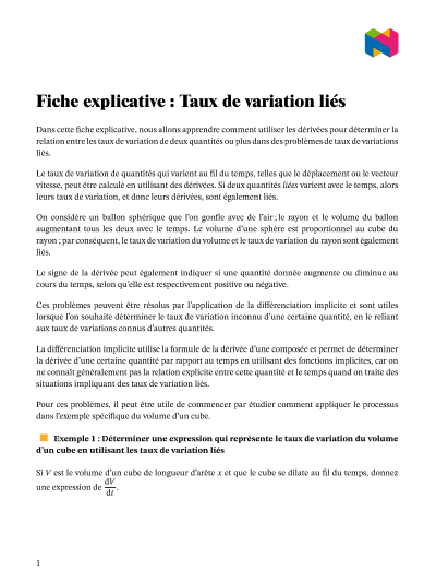 Dans cette leçon, nous allons apprendre comment utiliser les dérivées pour déterminer la relation entre les taux de variation de deux ou plusieurs quantités dans des problèmes sur les taux de variation liés.