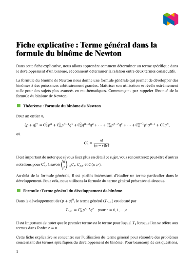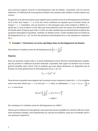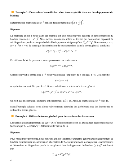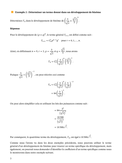 Dans cette leçon, nous allons apprendre à déterminer un terme spécifique dans le développement d'un binôme, et à déterminer la relation entre deux termes consécutifs.