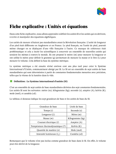 Dans cette leçon, nous allons apprendre à définir les unités de mesure SI et les unités dérivées, et à écrire et manipuler des équations algébriques.