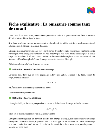 Dans cette leçon, nous allons apprendre comment définir la puissance d'une force comme étant la dérivée du travail fourni par la force.